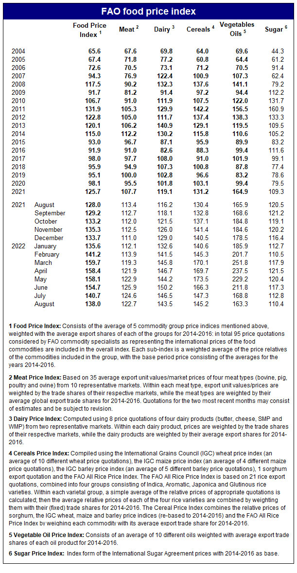 Marja xəbər verir ki, FAO-nun Ümumdünya Ərzaq Qiymətləri İndeksi iyulda 140,7-dən avqustda 138-ə düşüb. Mart ayında Rusiyanın Ukraynaya qarşı hücumunun başlamasından sonra indeks 159,7 bəndlə rekord həddə çatmışdı.