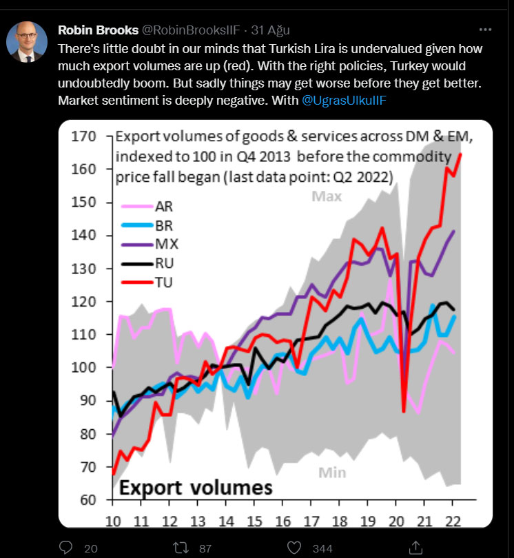 Marja xəbər verir ki, Robin Brooks “Türkiyənin xalis ixracatı son 2 ildə iqtisadi artıma töhfə verib. Bazarlara doğru kiçik bir addım belə kifayətdir ki, Türkiyə iqtisadiyyatı böyük bum yaratsın. Siyasətdə kiçik bir dəyişiklik bu böyük partlayışa səbəb olacaq” deyib.