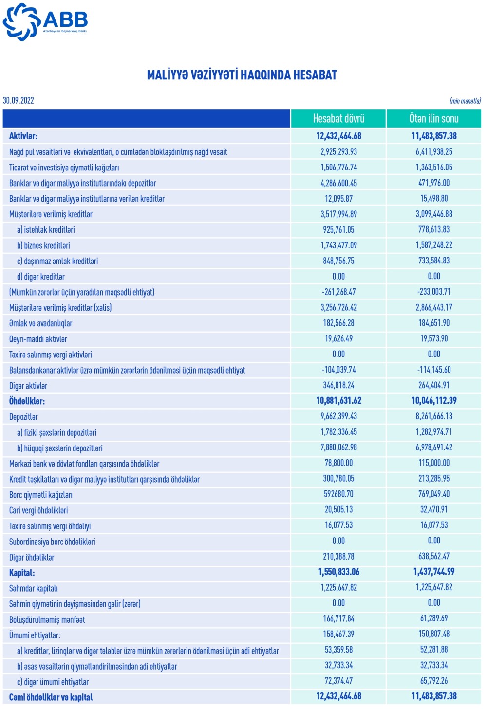 2021-ci ilin sonu ilə müqayisədə, cari ilin 9 ayı ərzində ABB-nin cəmi aktivləri 948 milyon 608 min manat artaraq 12 milyard 432 milyon 464 min manata çatıb. Bank ötən ilin sonunda 11 milyard 483 milyon 857 min manat cəmi aktivlərə malik idi.