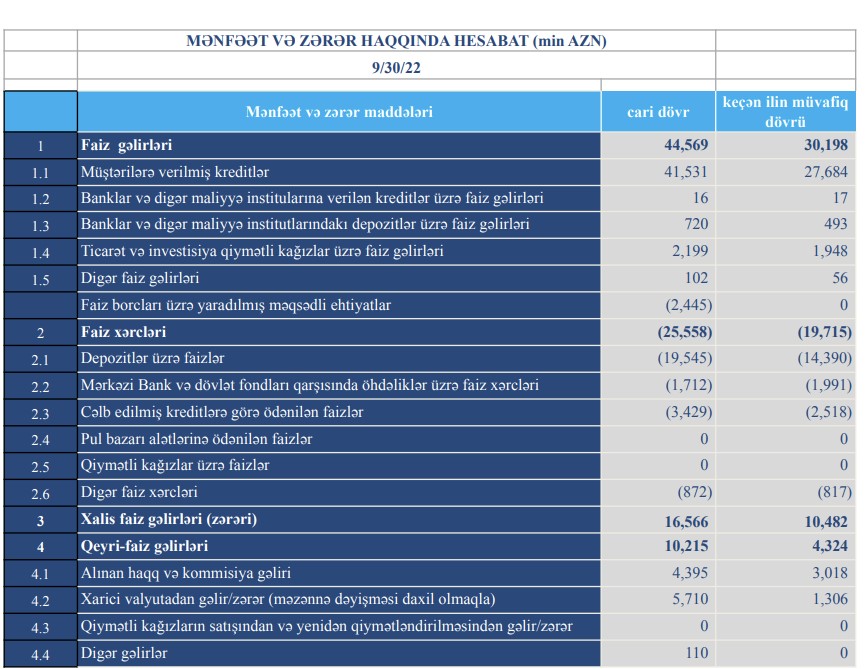 Eyni zamanda, Bank 2 milyon 445 min manatlıq faiz borcları üzrə məqsədli ehtiyat yaradıb.