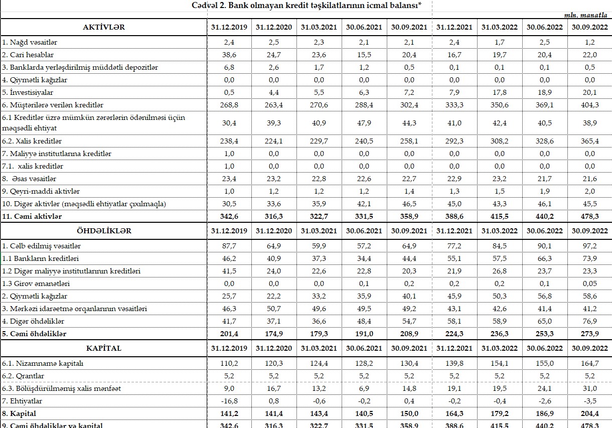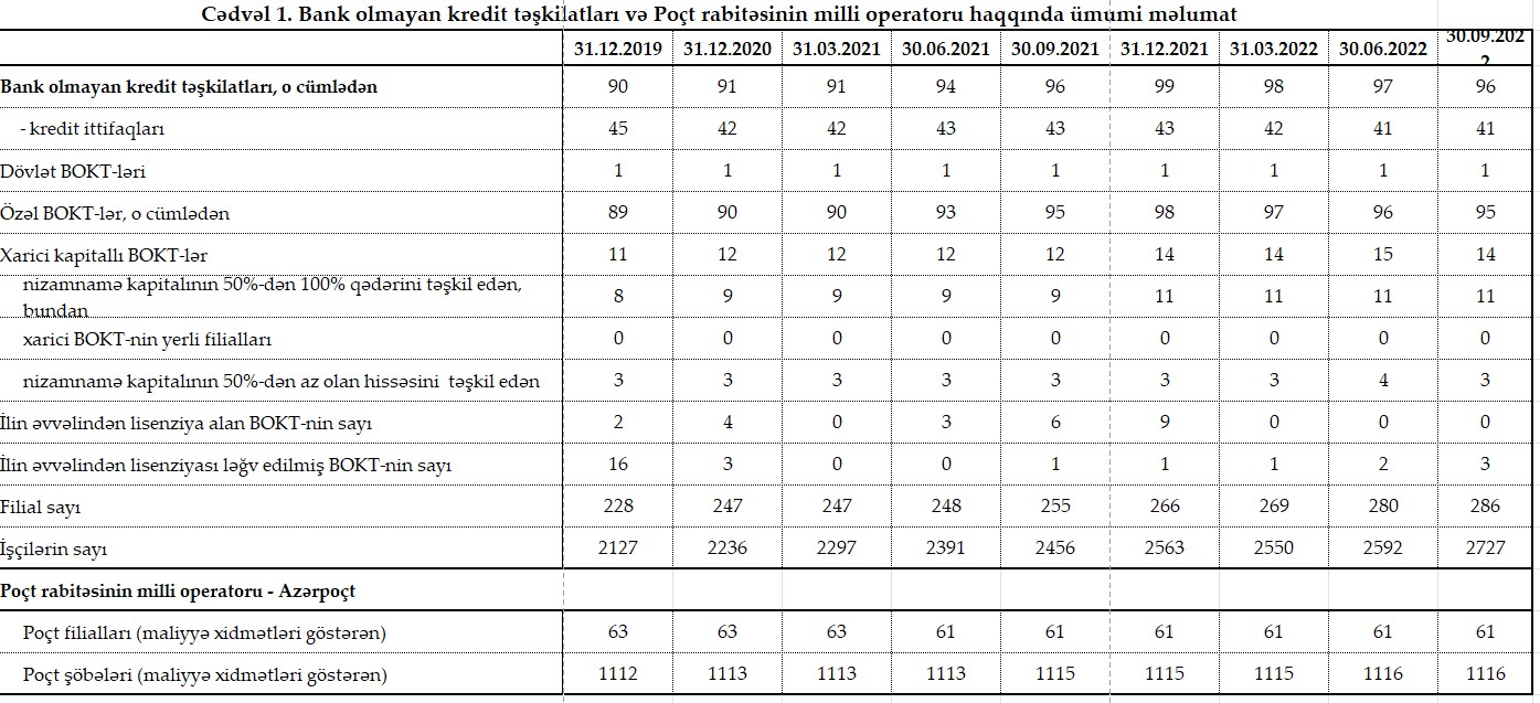 30 Sentyabr 2022-ci il tarixində Azərbaycanda 96 bank olmayan kredit təşkilatı fəaliyyət göstərib.