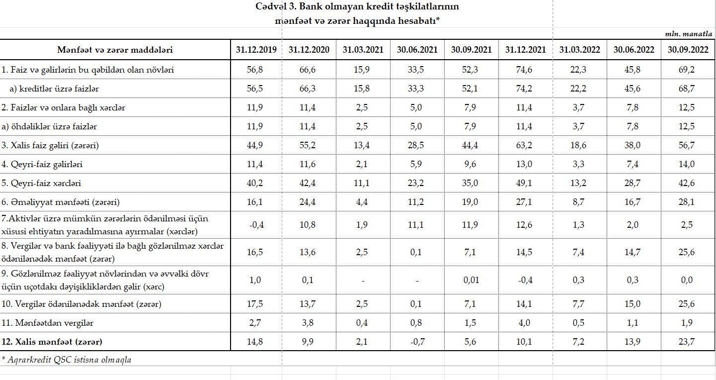 Azərbaycanda fəaliyyət göstərən bank olmayan kredit təşkilatları (BOKT) 2022-ci ilin 9 ayını 23,7 milyon manat xalis mənfəət ilə başa vurublar.