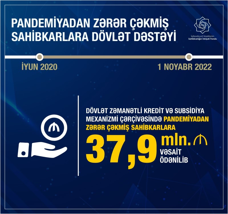 2020-ci ilin iyun ayından bu il noyabrın 1-dək dövlət zəmanətli kredit və subsidiya mexanizmi çərçivəsində pandemiyadan zərər çəkmiş sahibkarlara 37,9 milyon manat vəsait ödənilib.