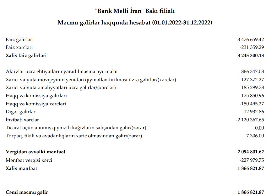"Bank Melli İran" Bakı filialı 2022-ci ili 1 milyon 867 min manat xalis mənfəət ilə başa vurub. Halbuki, filial 2021-ci ili 1 milyon 960 min manat xalis zərər ilə bağlamışdı. Ötən ilin xalis mənfəəti, əsasən ehtimal olunan zərərlər üzrə yaradılmış ehtiyatdan azad olmuş vəsait, faiz xərclərinin azalması və xarici valyuta əməliyyatları üzrə gəlirlərin artması ilə əlaqədardır.