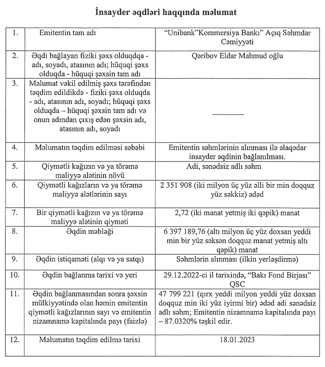 Marja.az xəbər verir ki, səhmlərin 6 milyon 397 min 190 manatlıq hissəsini Bankda ən böyük payla səhmdar olan Qəribov Eldar Mahmud oğlu əldə edib. Nəticədə Eldar Qəribovun "Unibank"ın nizamnamə kapitalındakı payı 86,6960%-dən 87,0320%-ə yüksəlib.