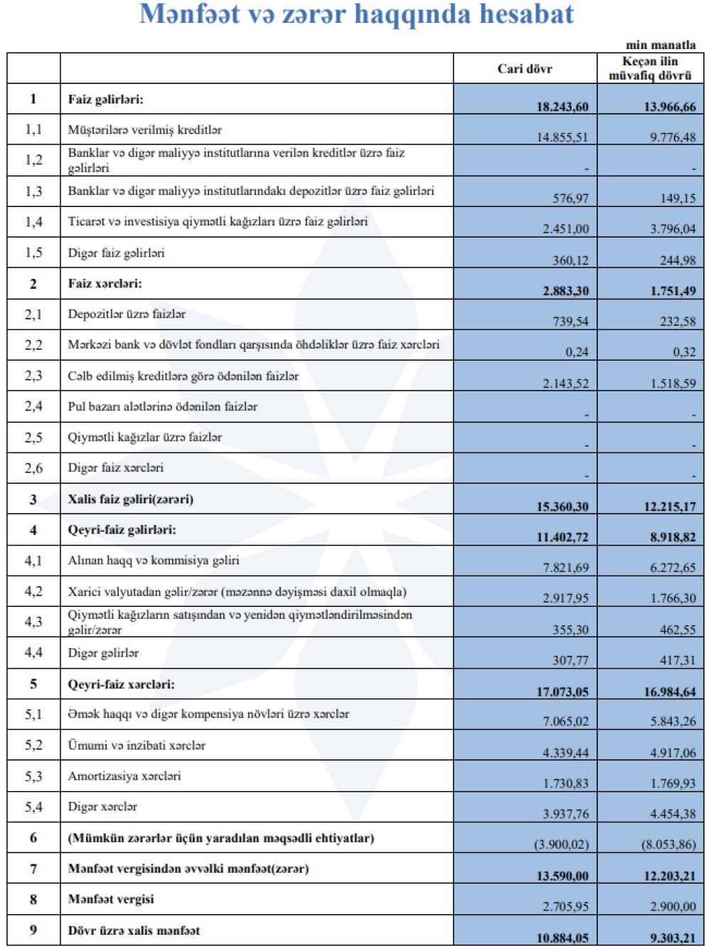 Ötən il "AFB Bank"ın gəlirləri xərclərini üstələdiyindən əməliyyat mənfəəti 9 milyon 689 min manat təşkil edib. Eyni zamanda, mümkün zərərlər üçün yaradılan ehtiyatlardan azad olmuş 3 milyon 900 min manat mənfəətə əlavə edilib.