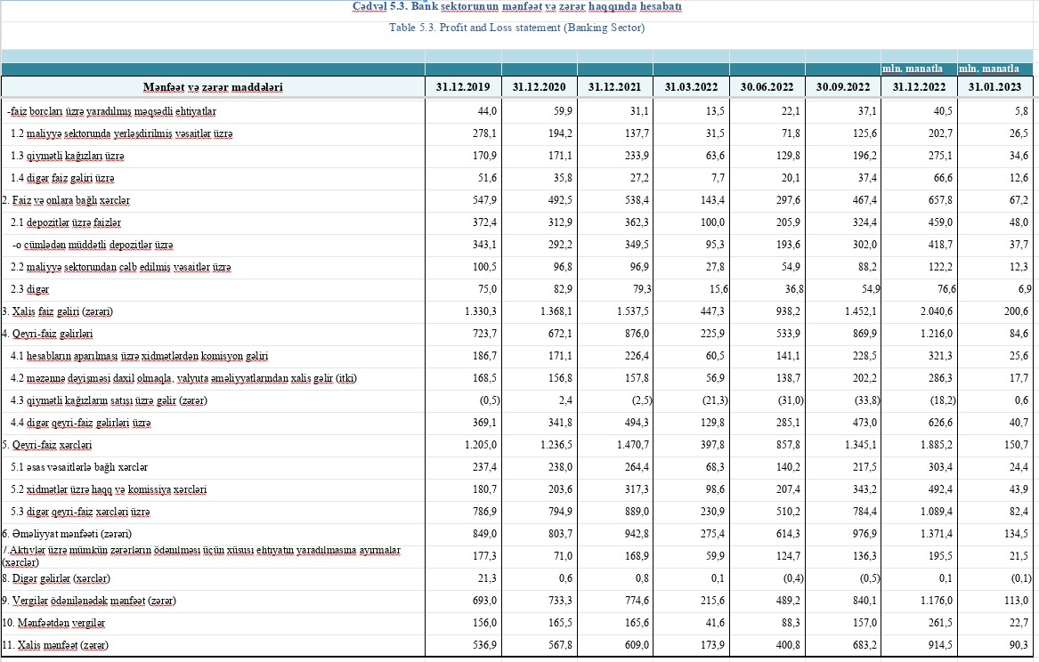 2023-cü ilin yanvar ayında banklar 134.5 milyon manat məbləğində əməliyyat mənfəəti, 90,3 milyon manat xalis mənfəət əldə ediblər.