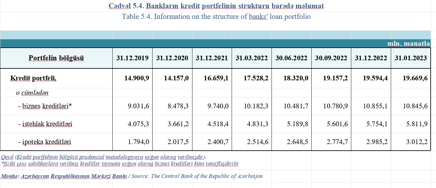 2022-ci ilin sonu ilə müqayisədə 2023-cü ilin yanvar ayında bankların cəmi kredit portfeli 75 milyon 236 min manat artıb və 31 Yanvar 2023-cü il tarixində 19 milyard 669 milyon 591 min manat təşkil edib.