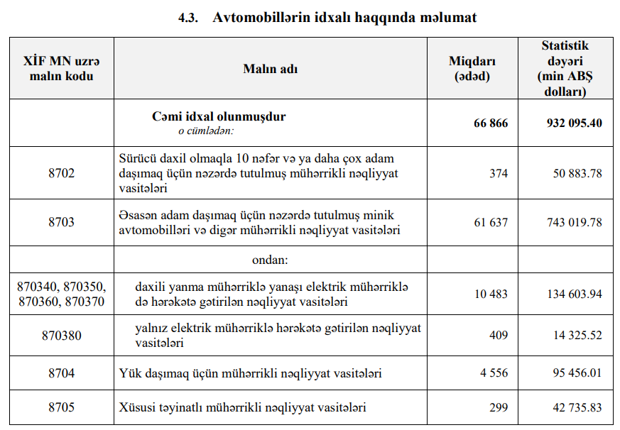 2023-cü ilin 11 ayı ərzində (yanvar-noyabr) Azərbaycana 111 milyon 47 min dollar dəyərində 2 min 737 ədəd yalnız yalnız elektrik mühərriklə hərəkətə gətirilən nəqliyyat vasitələri (tam elektromobil) idxal olunub. Ötən ilin eyni dövrü ilə müqayisədə elektromobillərin idxalı say üzrə 2 min 328 ədəd və ya 6,7 dəfə, dəyər üzrə isə 96 milyon 722 min dollar və ya 7,7 dəfə artıb. 2022-ci ilin 11 ayı ərzində Azərbaycana 14 milyon 325 min dollar dəyərində 409 ədəd yalnız elektrik mühərriklə hərəkətə gətirilən nəqliyyat vasitələri idxal olunmuşdu.