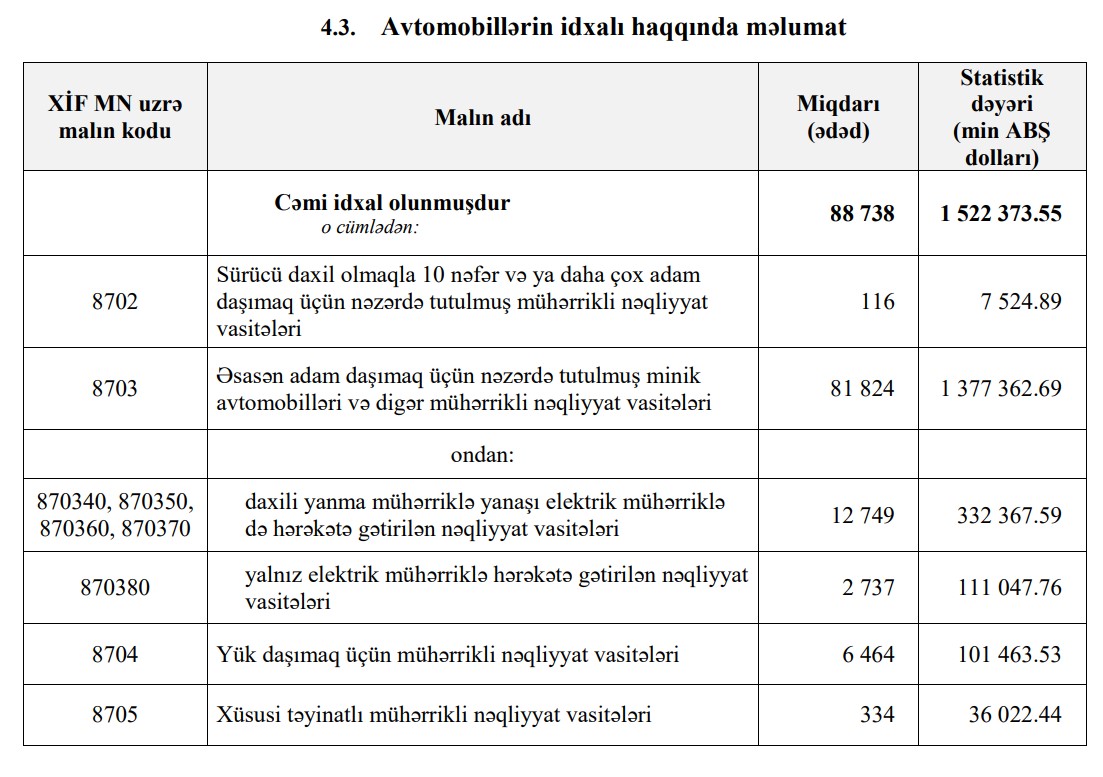 Xəbər verdiyimiz kimi, 2023-cü ilin yanvar-noyabr dövründə (11 ayda) Azərbaycana 1 milyard 522 milyon 373 min dollar dəyərində 88 min 738 ədəd nəqliyyat vasitəsi (avtomobil) idxal olunub. 2022-ci ilin yanvar-noyabr aylarında Azərbaycana 932 milyon 95 min dollar dəyərində 66 min 866 ədəd nəqliyyat vasitəsi idxal olunmuşdu. Azərbaycana 2023-cü ilin 11 ayında ötən ilin eyni dövrü ilə müqayisədə 21 min 872 ədəd və ya 32,7% daha çox avtomobil idxal edilib.
