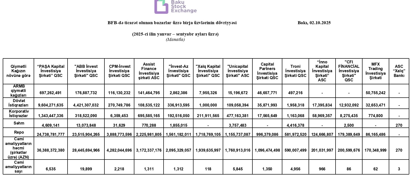 Marja.az Birjaya istinadən xəbər verir ki, “PAŞA Kapital İnvestisiya Şirkəti” QSC 36 milyard 388 milyon 372 min manat dövriyyə ilə 1-ci,  "ABB İnvest İnvestisiya Şirkəti" QSC 28 milyard 445 milyon 695 min manat dövriyyə ilə 2-ci, "CPM-İnvest İnvestisiya Şirkəti" QSC 4 milyard 282 milyon 45 min manat dövriyyə ilə 2-ci yeri tutub.