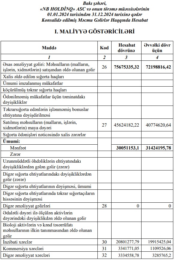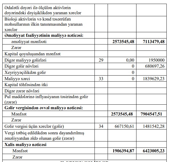 "Cəmiyyətin əsas fəaliyyətindən gəliri 31 dekabr 2024-cü iltarixdə bitən il üzrə 75675335.32 manat, xərclər isə 73101789.84 manat olmuşdur. 31 dekabr 2024-cü il tarixə ümumi mənfəət 2573545.48 manat olmuşdur. Cəmiyyət 2024-cü ili 1906394.87 manat xalis mənfəətlə başa vurmuşdur", - Şirkətin hesabatında bildirilir.