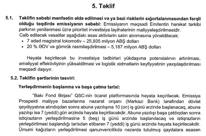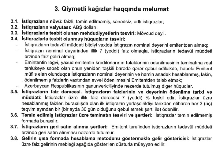 Marja.az Emissiya Prospektinə istinadən xəbər verir ki, dövlət şirkəti hər birinin nominal dəyəri 100 ABŞ dolları olan 300 min ədəd faizli, təmin edilməmiş, sənədsiz, adlı istiqrazlar buraxır.