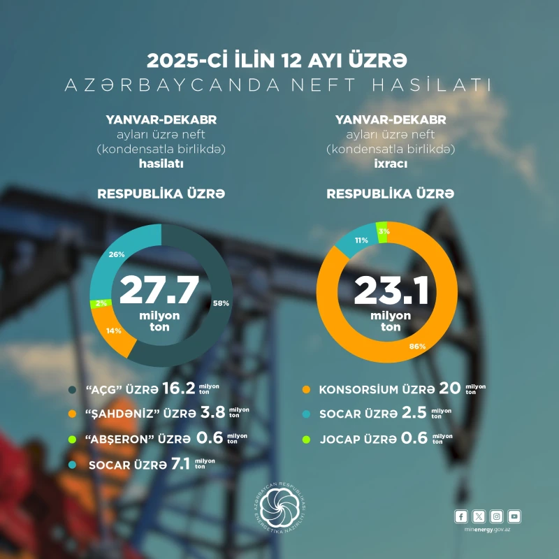 Marja.az xəbər verir ki, 2025-ci il üzrə operativ məlumatlara əsasən, respublikada 27,7 milyon ton neft (qaz kondensatı ilə birlikdə) hasil edilib. Hasilatın 16,2 milyon tonu “Azəri-Çıraq-Günəşli”nin, 3,8 milyon tonu “Şahdəniz”in, 0,6 milyon tonu “Abşeron” yatağının, 7,1 milyon tonu isə SOCAR-ın payına düşüb.
