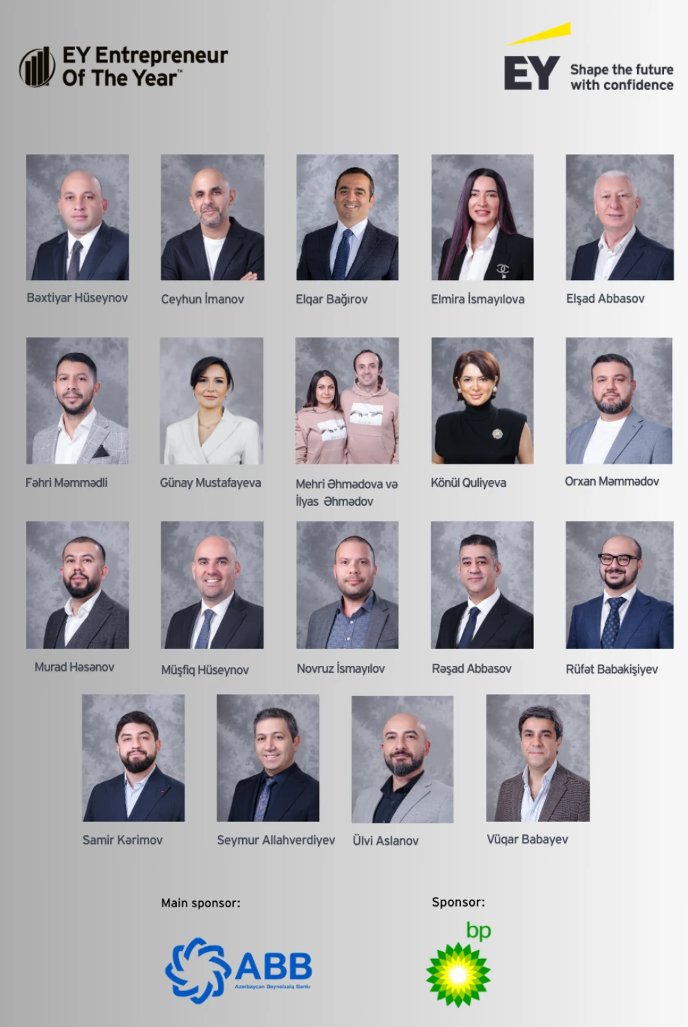 “EY İlin İş Adamı” müsabiqəsi yenilikçi düşüncə tərzi, uğur qazanmaq iradəsi və cəmiyyətə müsbət təsir göstərmək məqsədi ilə fəaliyyət göstərən sahibkarları bir araya gətirən nüfuzlu və unikal bir proqramdır. Bu müsabiqə öz hədəflərinə doğru inamla addımlayan sahibkarları qiymətləndirir və onların nailiyyətlərini qeyd edir.