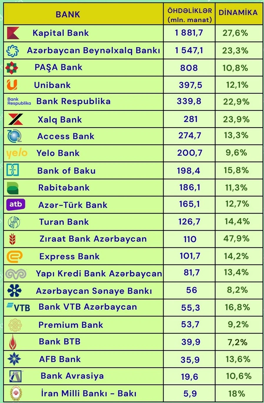 Bunlar, “Kapital Bank” (1 milyard 881,7 milyon manat), “Azərbaycan Beynəlxalq Bankı” (1 milyard 547,1 milyon manat), “PAŞA Bank” (808 milyon manat), “Unibank” (397,5 milyon manat) və “Bank Respublika”dır (339,8 milyon manat).