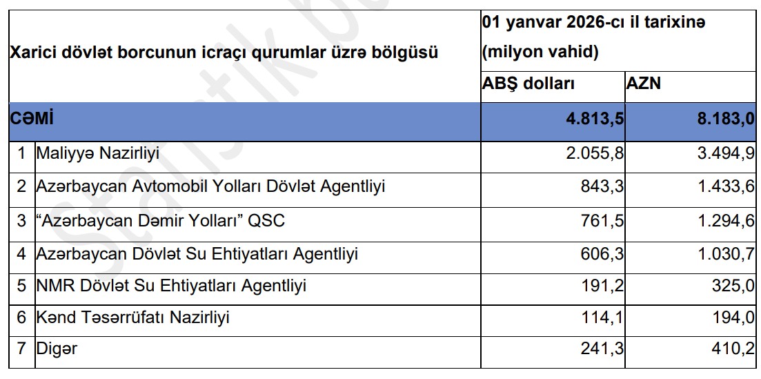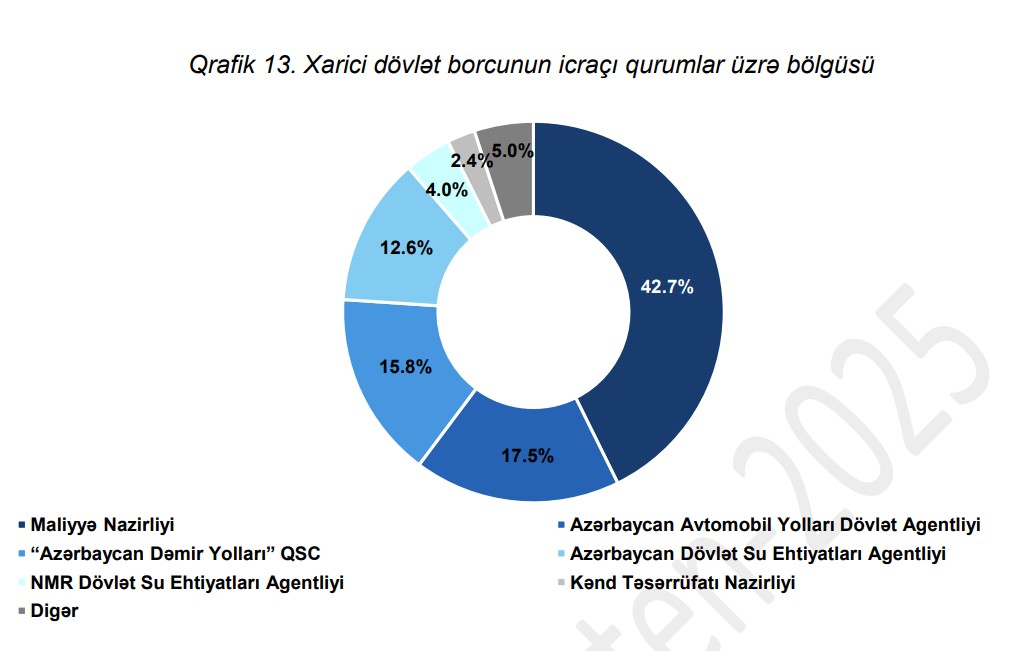 01 Yanvar 2026-cı il tarixinə olan məlumata görə, Maliyyə Nazirliyinin 3 milyard 494,9 milyon manat, Azərbaycan Avtomobil Yolları Dövlət Agentliyinin 1 milyard 433 milyon manat, “Azərbaycan Dəmir Yolları” QSC-nn 1 milyard 294,6 milyon manat, Azərbaycan Dövlət Su Ehtiyatları Agentliyi nin 1 milyard 30,7 milyon manat xaici bocu var.