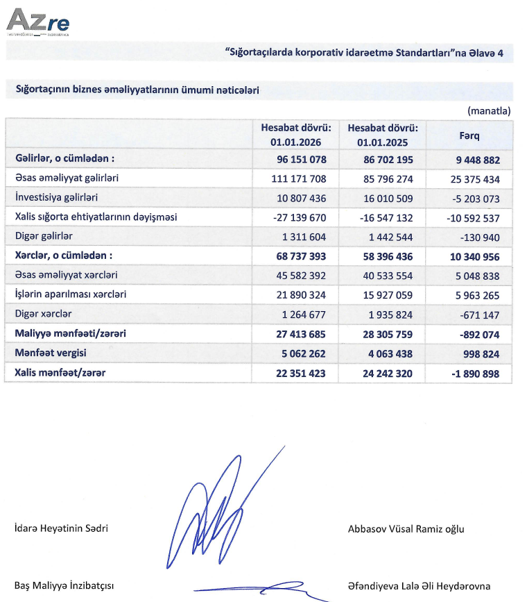 "AzRe Təkrarsığorta" ASC 2025-ci ili 22 milyon 351 min manat xalis mənfəət ilə başa vurub. Şirkət 2024-cü ili 24 milyon 242 min manat xalis mənfəət ilə bağlamışdı. Beləliklə, "AzRe Təkrarsığorta"nın xalis mənfəəti 2025-ci ildə 2024-cü illə müqayisədə 1 milyon 891 min manat və ya 7,8% azalıb.