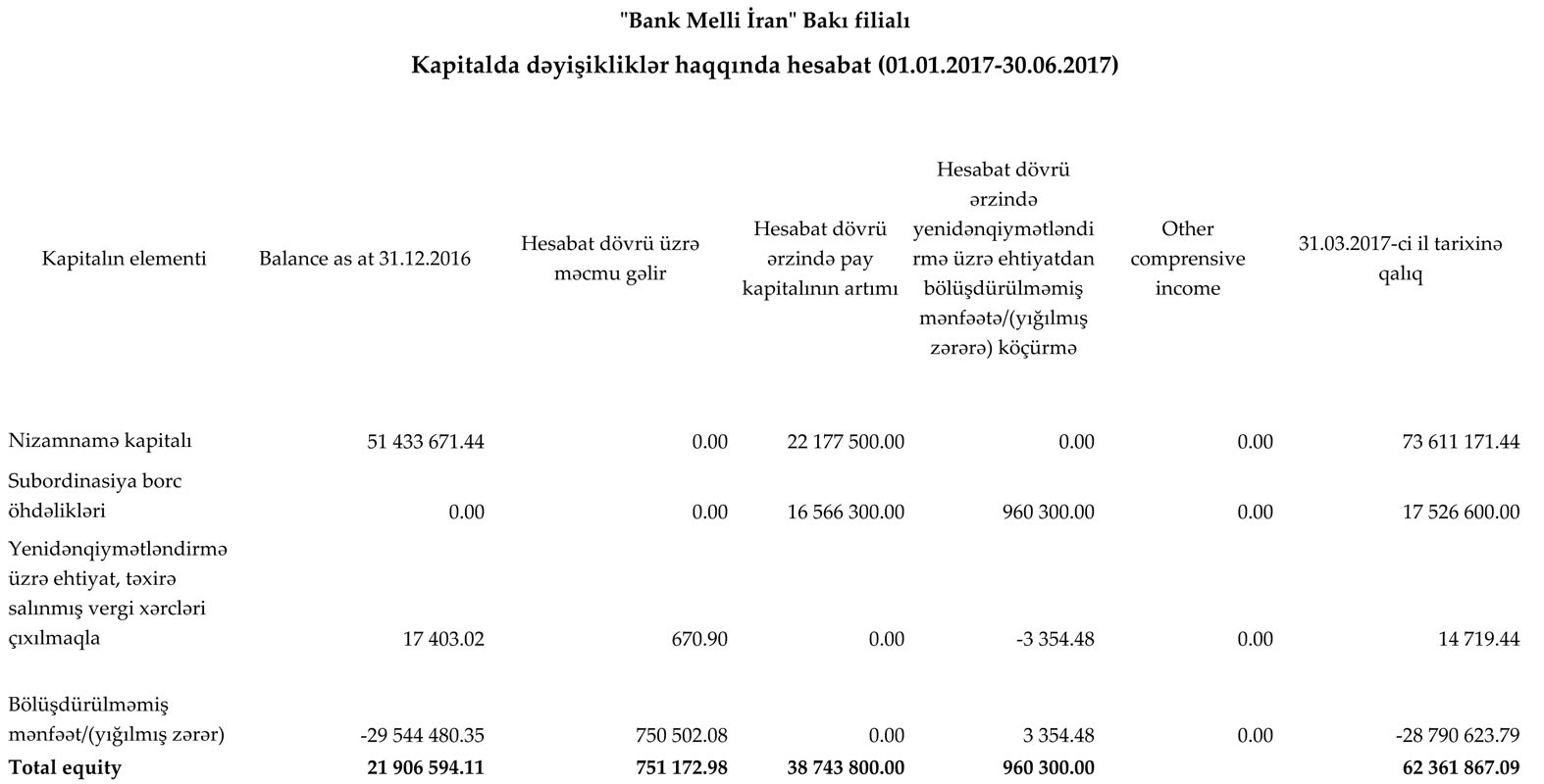 Halbuki, Bank 2016-cı ilin eyni dövründə 15 milyon 370 min manat zərər etmişdi. Zərərin yaranmasının səbəbi aktivlər üzrə ehtiyatların yaradılmasına 16 milyon 873 min manat ayrılması idi. "Bank Melli İran" Bakı filialının lisenziyası ləğv edilmiş banklarda depozitləri qalıb. Bu səbəbdən filial qaydalara uyğun olaraq böyük ehtiyat yaratmaq məcburiyyətində qalmışdı.