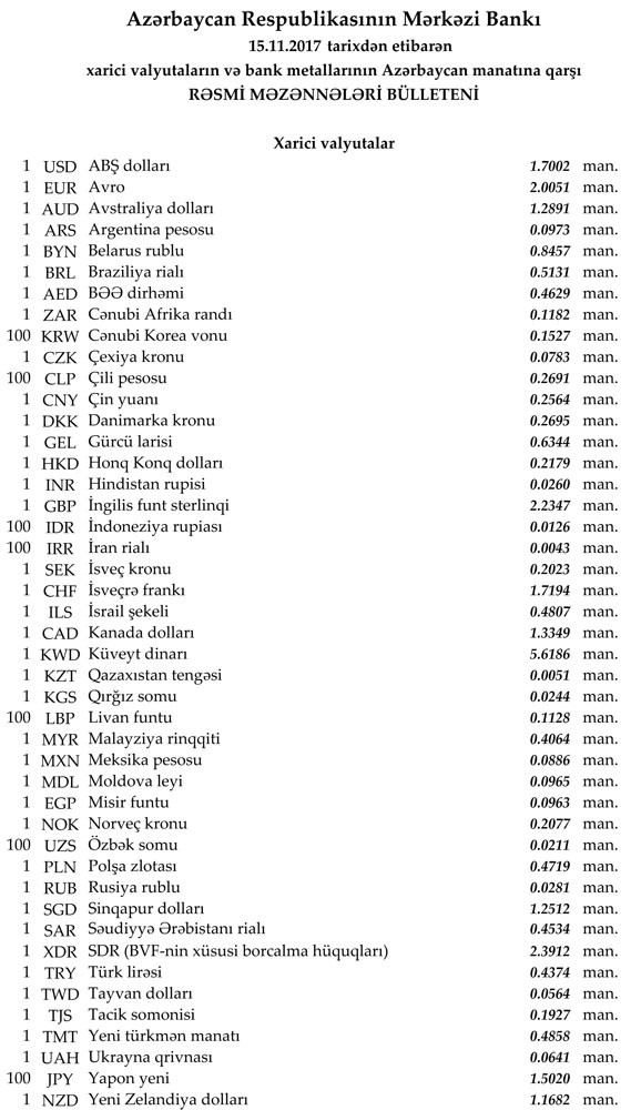 Noyabrın 15-nə Mərkəzi Bankın açıqladığı rəsmi Dollar/manat məzənnəsi Noyabrn 14-ü ilə müqayisədə dəyişməyərək 1,7002 manat olub, Avro/manat məzənnəsi 2.0051 manata qalxıb, Rubl/manat məzənəsi isə 0,0281 manatda düşüb.