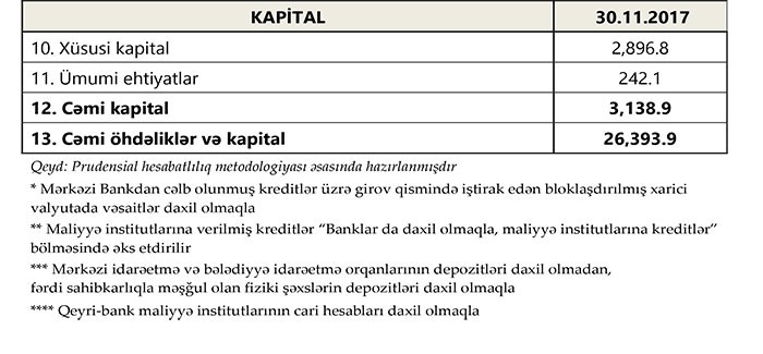 Məlumata görə, sektorun balans kapitalı 3 milyard 138.9 milyon manat, əhalinin əmanətləri isə 7 milyard 346.6 milyon manat olmuşdur. Noyabr ayında əhalinin əmanətləri 1.3% və ya 96.4 mmilyon manat artmışdır.