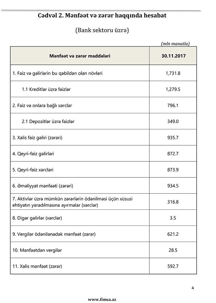 30 noyabr 2017-ci il tarixinə bank sektorunun əsas göstəriciləri bank sektorunun icmal göstəricilərində öz əksini tapmışdır.