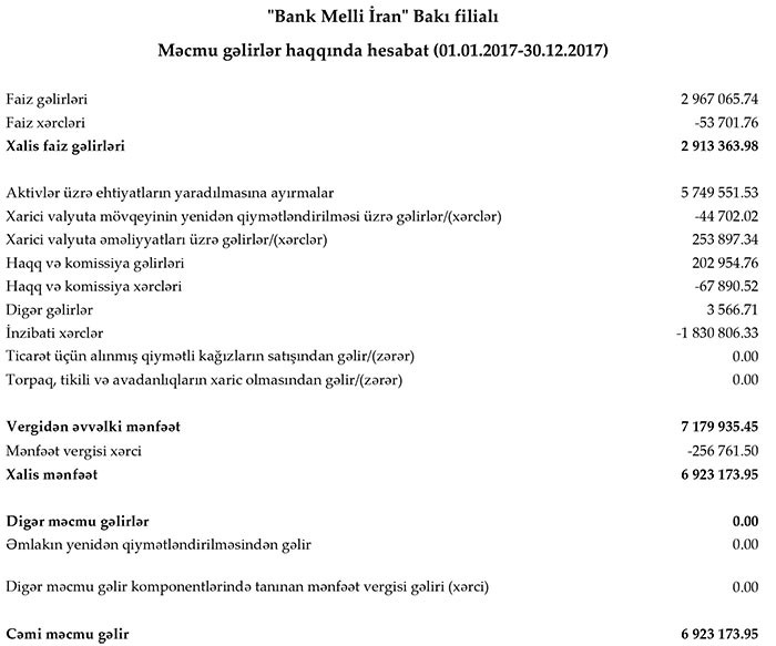 2016-cı ildə 29 milyon 264 min manat zərər edən "Bank Melli İran" Bakı filialı 2017-ci ili 6 milyon 923 min manat xalis mənfəətlə başa vurub.