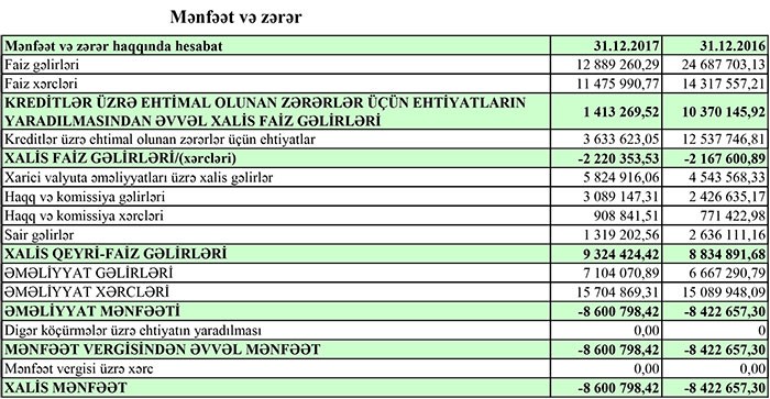 “Marja” xəbər verir ki, ötən il Bankın faiz gəlirləri 12 milyon 889 min manat, qeyri-faiz gəlirləri 10 milyon 233 min manat təşkil edib. Faiz, qeyri-faiz xərcləri və ehtiyatlara ayırma çıxıldıqdan sonra Bankın 7 milyon 104 min manat əməliyyat gəliri yaranıb. 15 milyon 704 min manat əməliyyat xərci, bankın ötən ili 8 milyon 601 min manat zərər ilə bağlamasına səbəb olub.