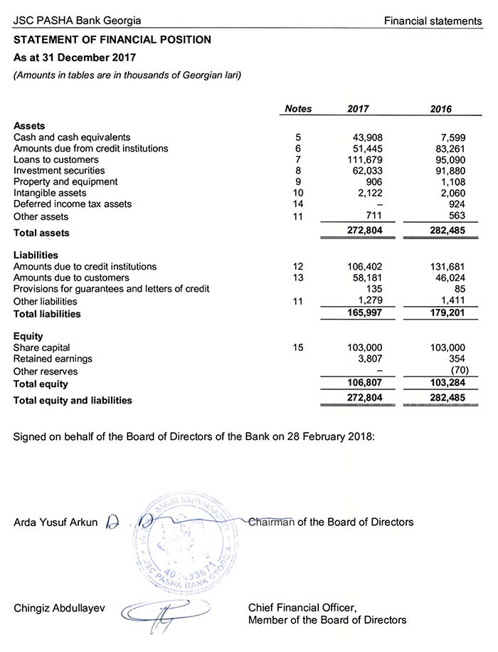 31 Dekabr 2017-il tarixində “PAŞA Bank Gürcüstan” 272 milyon 804 min lari cəmi aktivlərə, 165 milyon 997 min lari cəmi öhdəliklərə və 106 milyon 807 min lari cəmi kapitala malik olub.