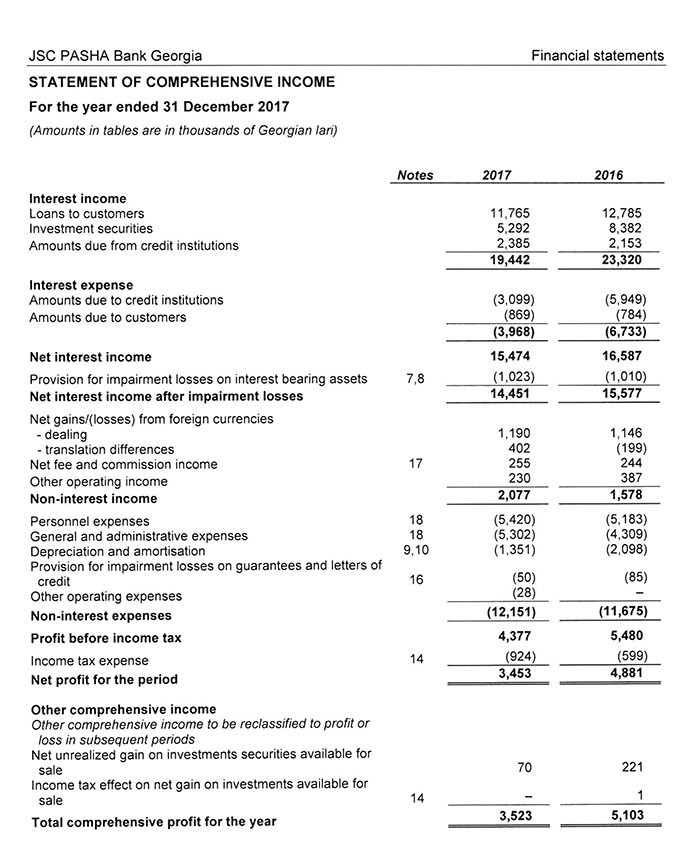 2016-cı ildə Bankın faiz gəlirləri 12 milyon 785 min lari, qeyri-faiz gəlirləri 1 milyon 578 min lari təşkil etmişdi. “PAŞA Bank Gürcüstan” 2016-cı ili 5 milyon 103 min lari (3,5 milyon manat) xalis mənfəət ilə bağlamışdı. Qısası, 2016-cı illə müqayisədə 2017-də Bankın faiz gəlirləri və xalis mənfəəti azalıb.