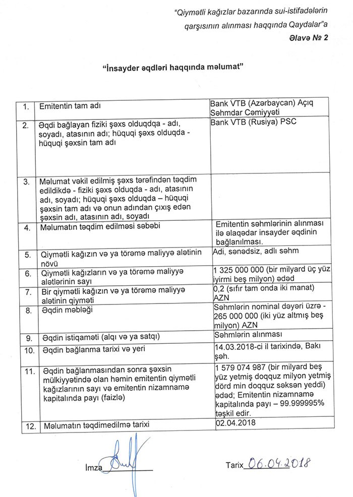 Əqdin bağlanmasından sonra Bank VTB (Rusiya)-nın Bank VTB (Azərbaycan)-da payı 99,999995%-ə çatıb.