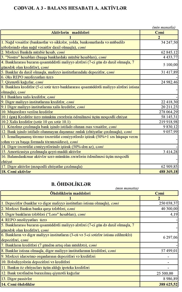 Bank ötən ilin sonunda 437 milyon 330 min manat cəmi aktivlərə, 362 milyon 364 min manat cəmi öhdəliklərə və 74 milyon 966 min manat cəmi balans kapitalına malik idi.