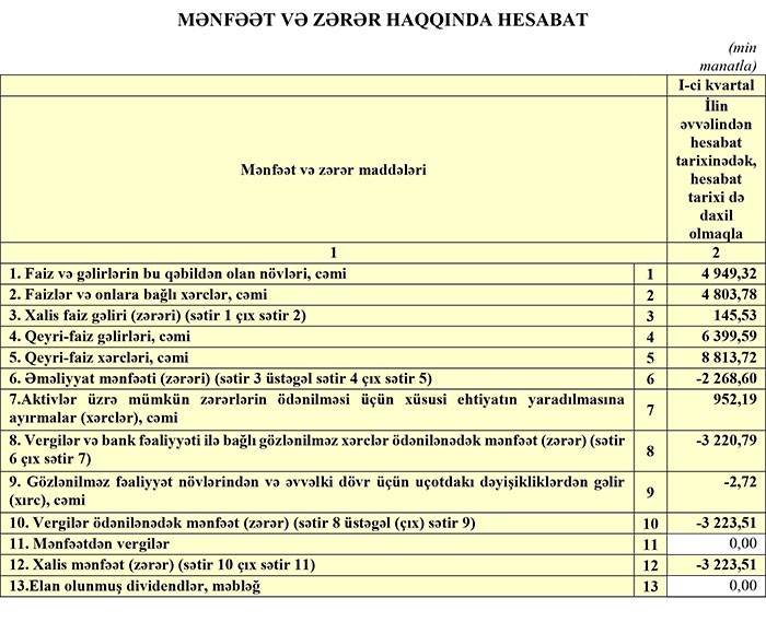 "AG Bank" ASC mənfəətə çıxa bilmir. Bank 2018-ci ilin 1-ci rübünü də 3 milyon 223 min manat zərər ilə başa vurub və "AgBank"da yığılmış zərər 70 milyon 402 min manata çatıb.