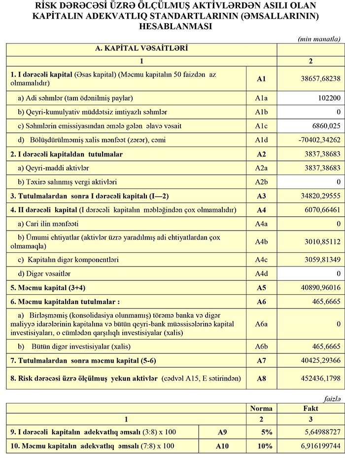 "Marja" Bankın açıqladığı maliyyə hesabatlarına istinadən xəbər verir ki, 30 Mart 2018-ci il tarixinə "AG Bank"ın məcmu kapitalı 40 milyon 425 manat təşkil edib. 2017-ci ilin sonunda Bank 44 milyon 572 min manat məcmu kapitala malik idi. Məcmu kapitalın azalmasının səbəbi yaranan zərərlərdir.