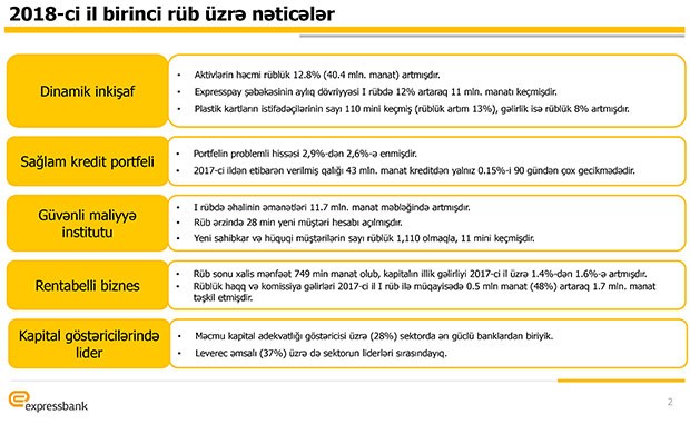 "ExpressBank" ASC 2018-ci ilin 1-ci rübünü 749 min manat xalis mənfəət ilə başa vurub. Halbuki Bank, 2017-ci ilin 1-ci rübünü 2 milyon 636 min manat xalis mənfəət ilə bağlamışdı.