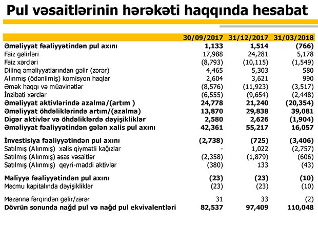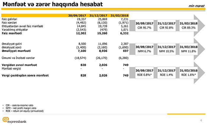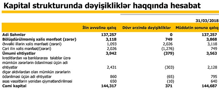 2018-ci ilin ilk rübündə Bankın əməliyyat mənfəəti 7 milyon 29 min manat, ümumi inzibati xərclər isə  6 milyon 280 min manat təşkil edib. Nəticədə Bank ilk rübü 749 min manat xalis mənfəətlə bağlayıb.