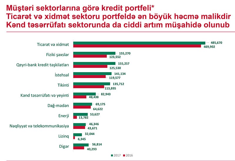 Konsolidə edilmiş 1 miyard 413 milyon manatlıq kredit portfelinin 1 milyard 250 milyon manatını hüquqi şəxslərə verilmiş kreditlər təşkil edib. Ən çox kreditlər ticarət və xidmət sektorlarına verilib.