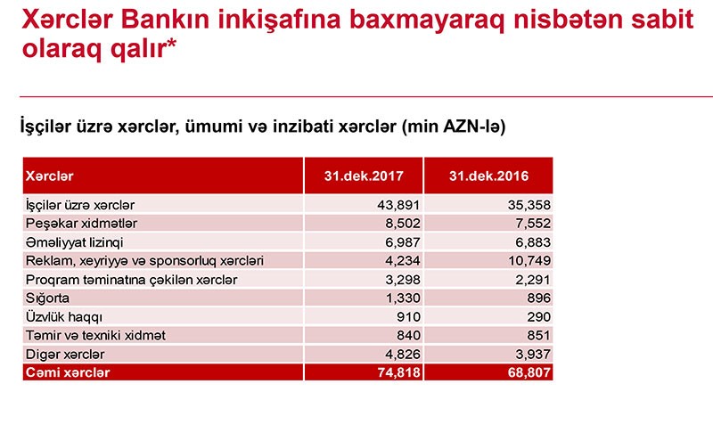 Ötən il PAŞA Bankın işçilər, ümumi və inzibati xərcləri 2016-cı ildəki 68,8 milyon manatdan 74,8 mlyon manata qalxmışdır. Xərclərin artmasının səbəbi işçi xərclərinin artmasıdır. 2017-ci ildə PAŞA Bankın işçilərinin sayı 170 nəfər ataraq 2017-ci ilin sonunda 620 nəfərə çatıb. İşçilərin məvacib və digər xərcləri ilə əlaqədar olaraq işçilər üzrə xərclər 35,6 milyon manatdan 43,8 milyon manata qalxmışdır.