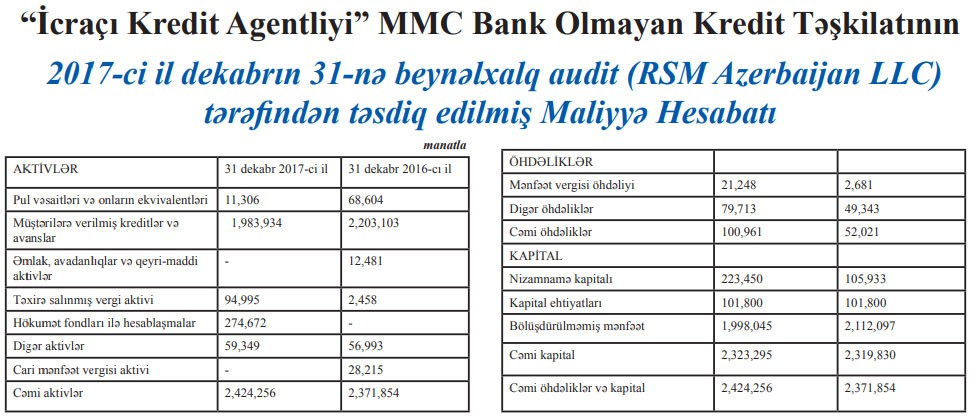 2017-ci ilin sonunda “İcraçı Kredit Agentliyi” MMC Bank Olmayan Kredit Təşkilatının (BOKT) cəmi aktivləri 2 milyon 424 min manat təşkil edib. “Marja” MMC-nin hesabatına istinadən xəbər verir ki, 2017-ci ildə BOKT-ın cəmi aktivləri cüzi artıb. 2016-cı ilin sonunda “İcraçı Kredit Agentliyi” 2 milyon 371 min manat cəmi aktivlərə malik idi.