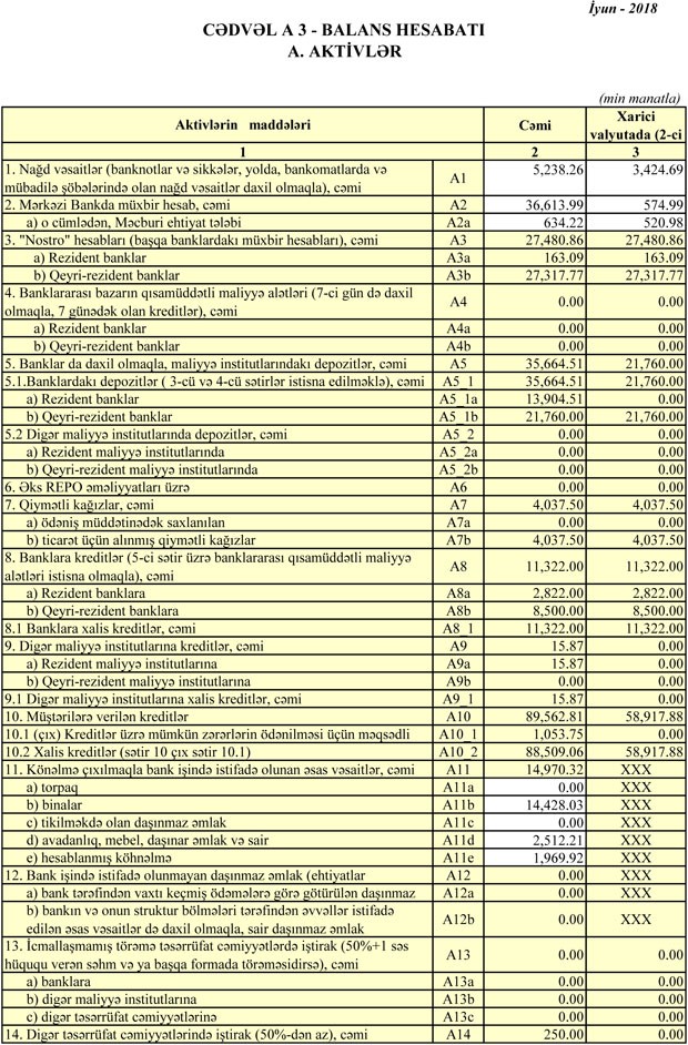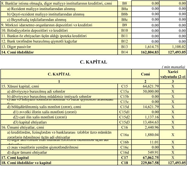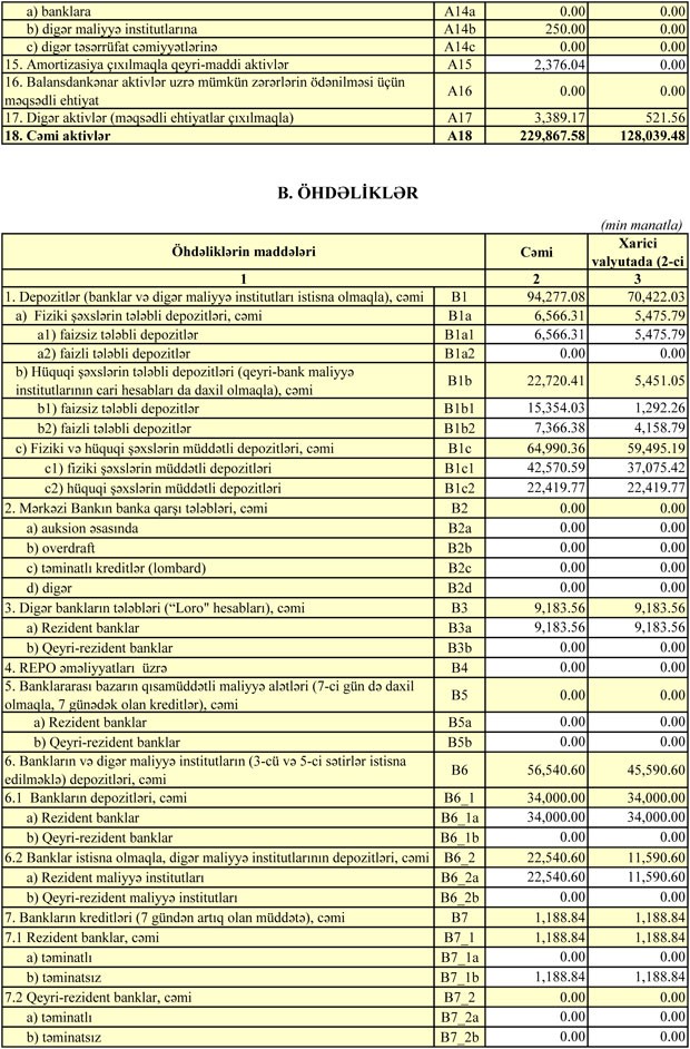 Bank 2017-ci ilin sonunda 186 milyon 665 min manat cəmi aktivlərə ( o cümlədən 67 milyon 884 min manatı müştərilərə verilmiş kreditlər), 120 milyon 769 min manat cəmi ökdəliklərə və 65 milyon 895 min manat cəmi balans kapitalına malik idi.