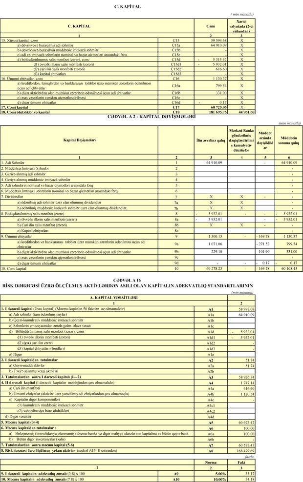 Xərclər çıxıldıqdan sonra Bankın 3 milyon 916 min manat əməliyyat mənfəəti qalıb. Əməliyyat mənfəətinin 3 milyon 299 min manatı aktivlər üzrə (ehtimal olunan kredit və depozit itkiləri üzrə ) mümkün zərərlərin ödənilməsi üçün xüsusi ehtiyatın yaradılmasına ayrıldığından Bankın xalis mənfəəti 617 min manat təşkil edib.