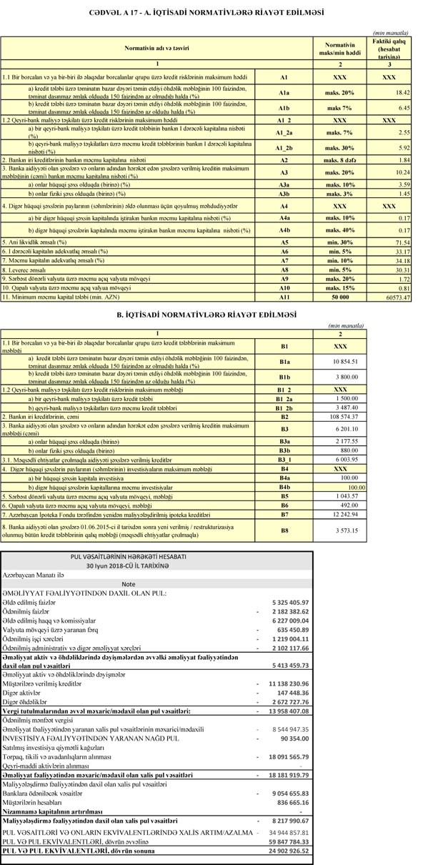 Ötən ilin sonunda 139 milyon 498 min manat olmuş kreditlər, 30 İyun 2018-ci il tarixində 147 milyon 734 min manata yüksəlib. Nağd vəsaitlər isə 15 milyon 748 min manatdan 19 milyon 683 min manata qalxıb.