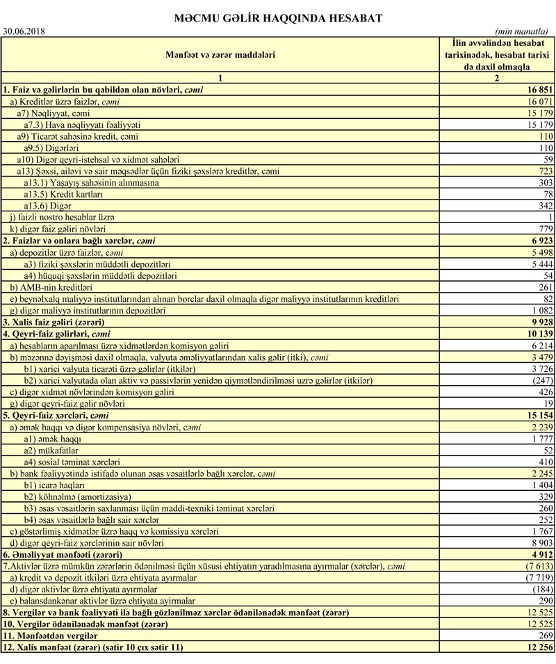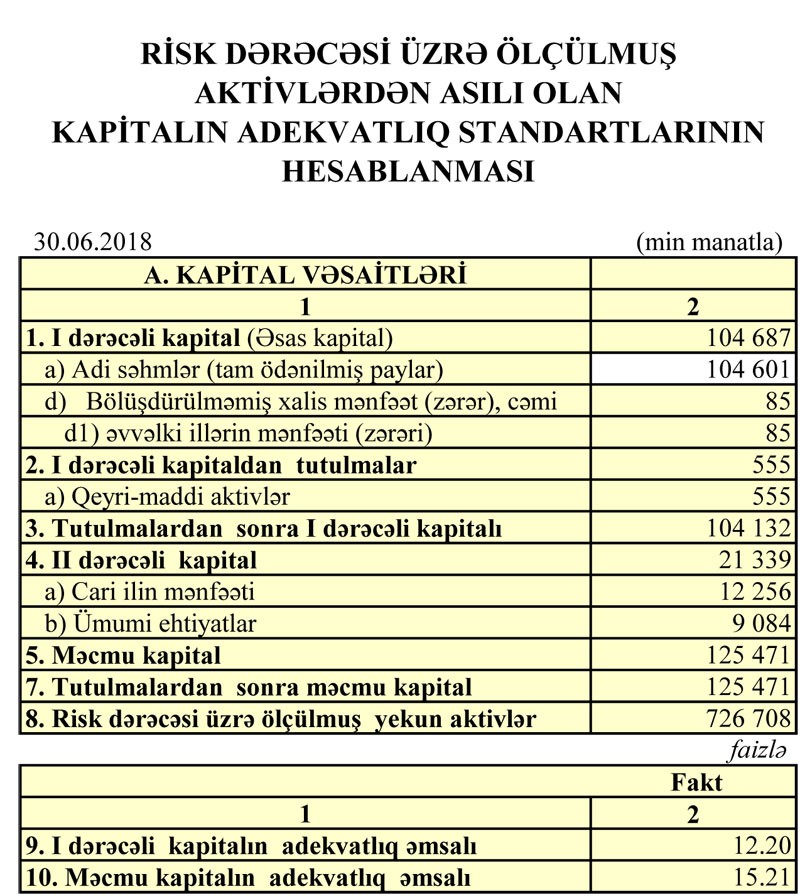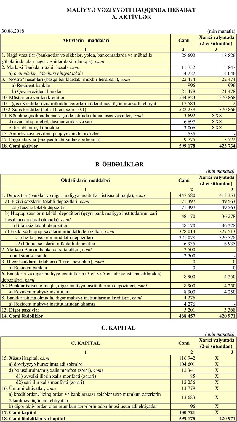 30 İyun 2017-ci il tarixində 174 milyon 91 min manat olmuş cəmi depozitlər 30 İyun 2018-ci il tarixində 447 milyon 580 min manata çatıb. O cümlədən, fiziki şəxslərin müddətli depozitləri 103 milyon 997 min manatdan 321 milyon 78 min manata qalxıb.