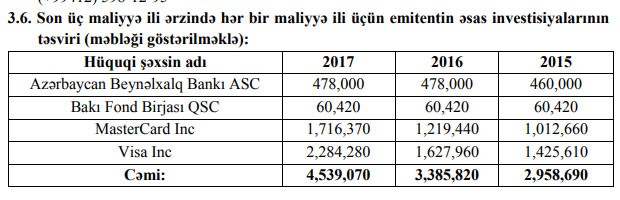 “Marja” xəbər verir ki, "Kapital Bank" “MasterCard Inc”a 2 milyon 73 min manat, “Visa Inc”a 2 milyon 767 min manat investisiya yatırıb.