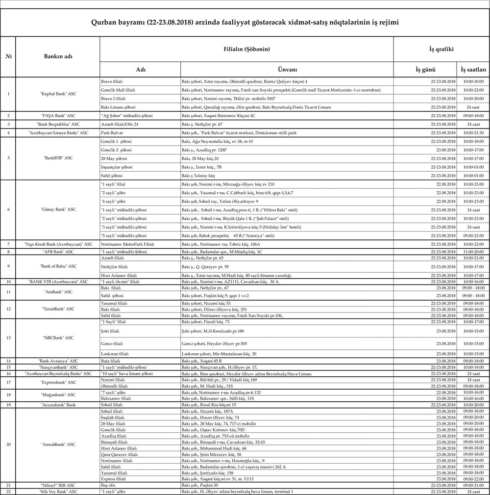 Maliyyə Bazarlarına Nəzarət Palatasının tövsiyəsi ilə Qurban bayramı ilə əlaqədar 22 və 23 avqust qeyri-iş günləri ərzində əhalinin və çoxsaylı turistlərin bank xidmətlərindən rahat faydalanması üçün bir sıra bankların filial və şöbələri gücləndirilmiş iş rejimində çalışacaq.