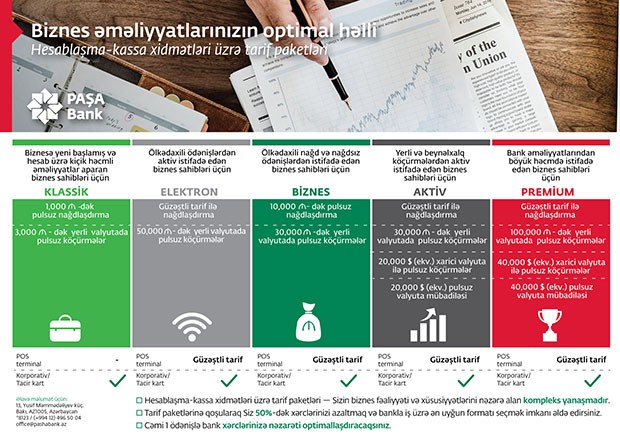 Xəbər verdiyimiz kimi, Azərbaycanın aparıcı korporativ bankı PAŞA Bank bazara yeni hesablaşma-kassa xidmətləri paketini təqdim edir. Məhsul kiçik və orta sahibkarlar üçün nəzərdə tutulur. Tarif paketləri hesablaşma-kassa əməliyyatlarının yerli və beynəlxalq ödənişlər, nağd vəsait ilə əməliyyatlar, valyuta əməliyyatları, korporativ kartlar, akvayrinq və s. kimi əsas xidmətlərdən ibarətdir.