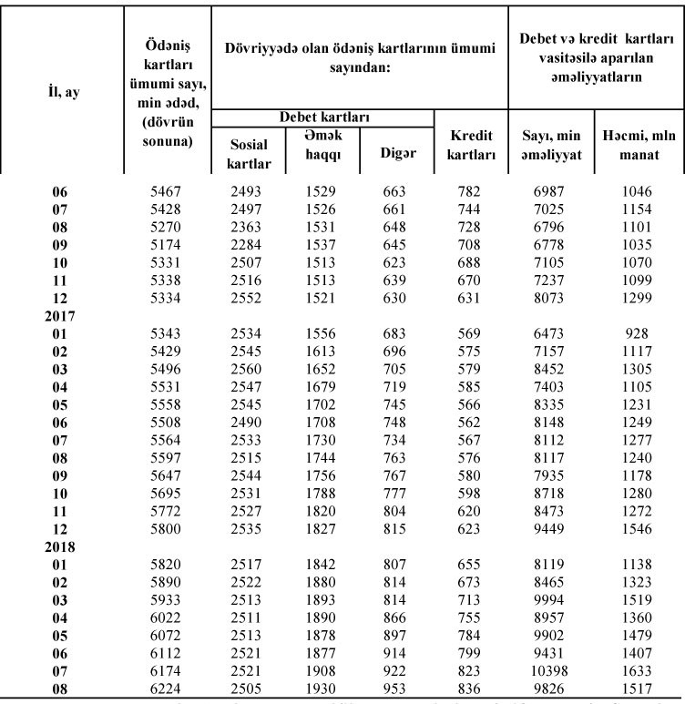 2018-ci ilin Avqust ayının sonunda cəmi ödəniş kartlarının sayı 6 milyon 224 min ədəd təşkil edib.
