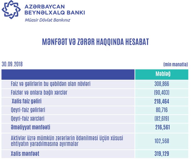 “Azərbaycan Beynəlxalq Bankı” ASC (ABB) 2018-ci ilin 9 ayını 319 milyon 129 min manat xalis mənfəətlə başa vurub. Müqayisə üçün qeyd edək ki, Bank 2017-ci ilin 9 ayını 469 milyon 893 min manat xalis mənfəətlə bağlamışdı. Bu mənfəətin 271 milyon manatı bankın xarici öhdəliklərinin könüllü restrukturizasiyası ilə bağlı idi. Restrukturizasiya ilə bağlı gəlirlər nəzərə alınmadıqda ötən ilin müvafiq dövründə Bankın xalis mənfəəti 198 milyon manat təşkil edirdi. Nəticədə bankın cari ilin 9 ayının xalis mənfəəti ötən ilin qeyd olunan birdəfəlik gəlirləri çıxıldıqdan sonrakı mənfəətindən 62% daha çoxdur.