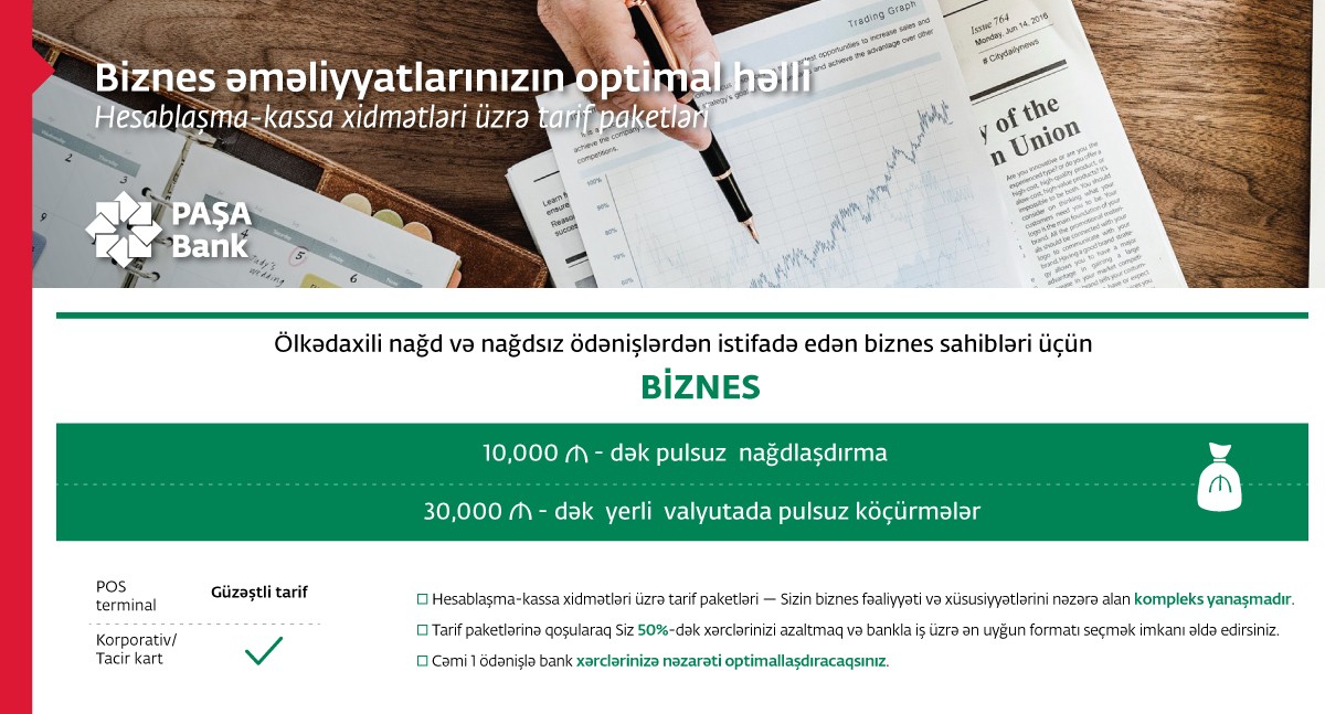 Tarif paketi kiçik və orta sahibkarlara 10 000 AZN-dək nağdlaşdırma və 30 000 AZN-dək bankdan kənar milli valyuta ilə pulsuz köçürmə imkanı yaradır.