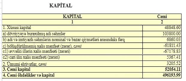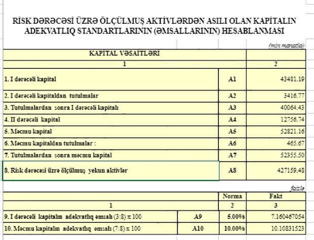 Bankın dayanıqlığını qiymətləndirmək üçün beynəlxalq praktikada istifadə olunan bir sıra göstəricilərdə də müsbət nəticələr əldə olunmuşdur. Belə ki, gəlirlərin və xərclərin artım tempi müvafiq olaraq 1,10 və 0,89 olmuş və nəticədə gəlirlərin artımının elastikliyi əmsalı 1,24 olmuşdur. Əmsalın 1-dən çox olması vəsaitlərin qənaətlə istifadəsini göstərir. 2018-ci ilin nəticəsinə görə bank keçmiş illərdə itirmiş kapitalını bərpa etmişdir. Belə ki, 31 dekabr 2018-ci il tarixinə bankın məcmu kapital 52,4 milyon manat və məcmu kapitalın adekvatlıq əmsalı 10,11% təşkil etmişdir".